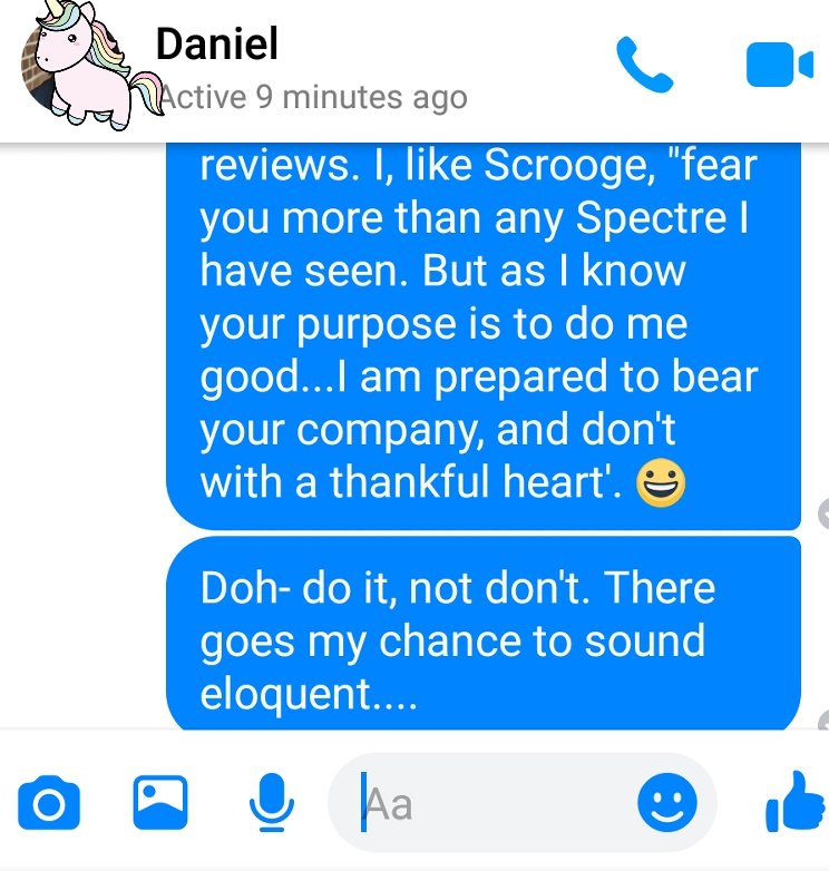 That being said, I still am looking for a good literary therapist. When submitting my chapter to the award winning writer for tips I quoted Dickens- and may have called him a terrifying spectre… and autofill did its thing. So… how’d I do at first impressions?
